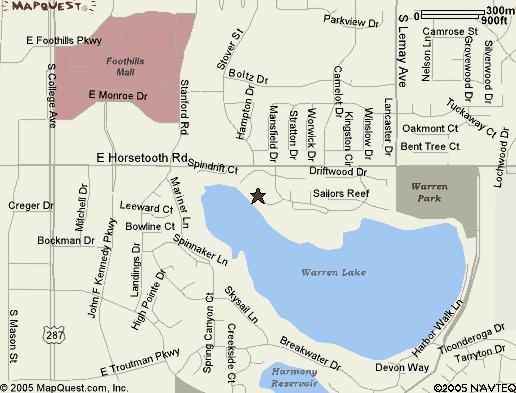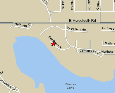 COLLEGE AND HORSETOOTH ROADS 1. Travel 0.6 miles East on Horsetooth Road through the traffic ligth at Stover. Turn right on North Star Course which is just 0.1 mile after the Stover traffic light. 2. Head south on North Star Course for 0.1 mile, up a small grade, and turn right on Sandpiper Point. 3. Head southwest on Sandpiper Point until the Cul-de-Sac forces a U-Turn. 713 is on the left [south] side of the Cul-de-Sac. |